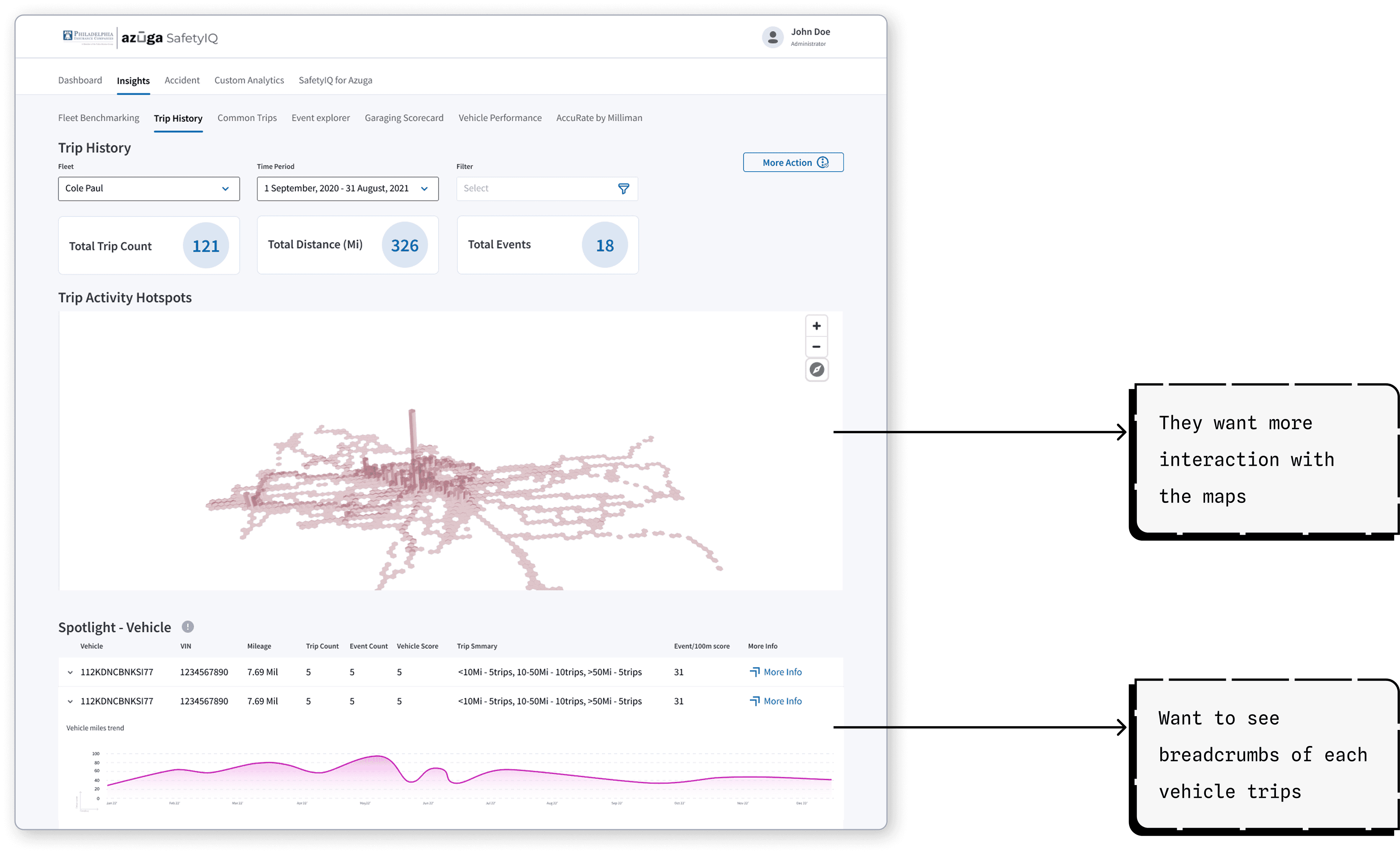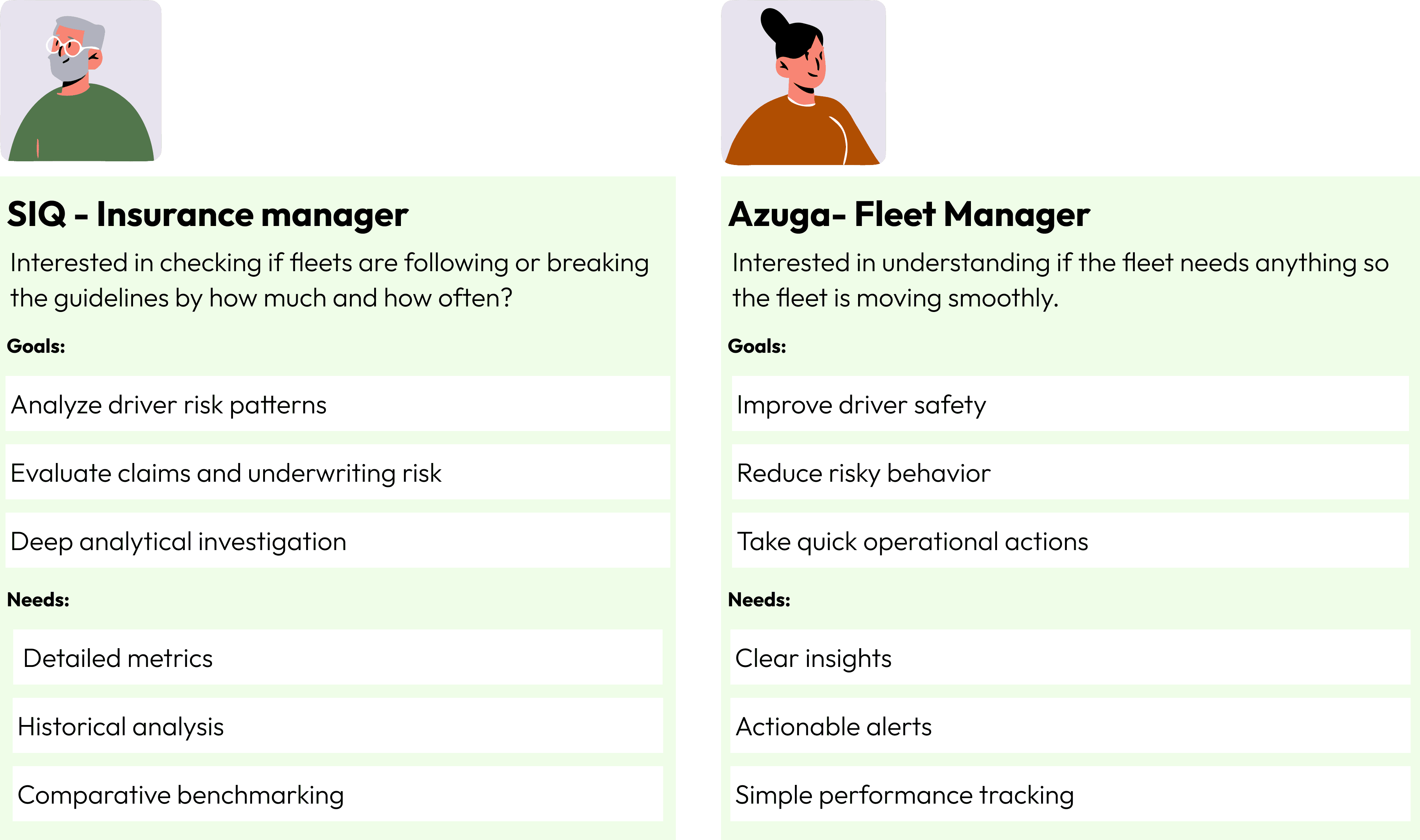 SafetyIQ was originally designed to help insurance teams analyze driver risk and safety patterns through advanced analytics dashboards. As adoption grew, we saw an opportunity to bring these powerful insights into Azuga Fleet, where fleet managers could proactively improve safety operations. This required translating complex insurance analytics into actionable operational insights for fleet teams.